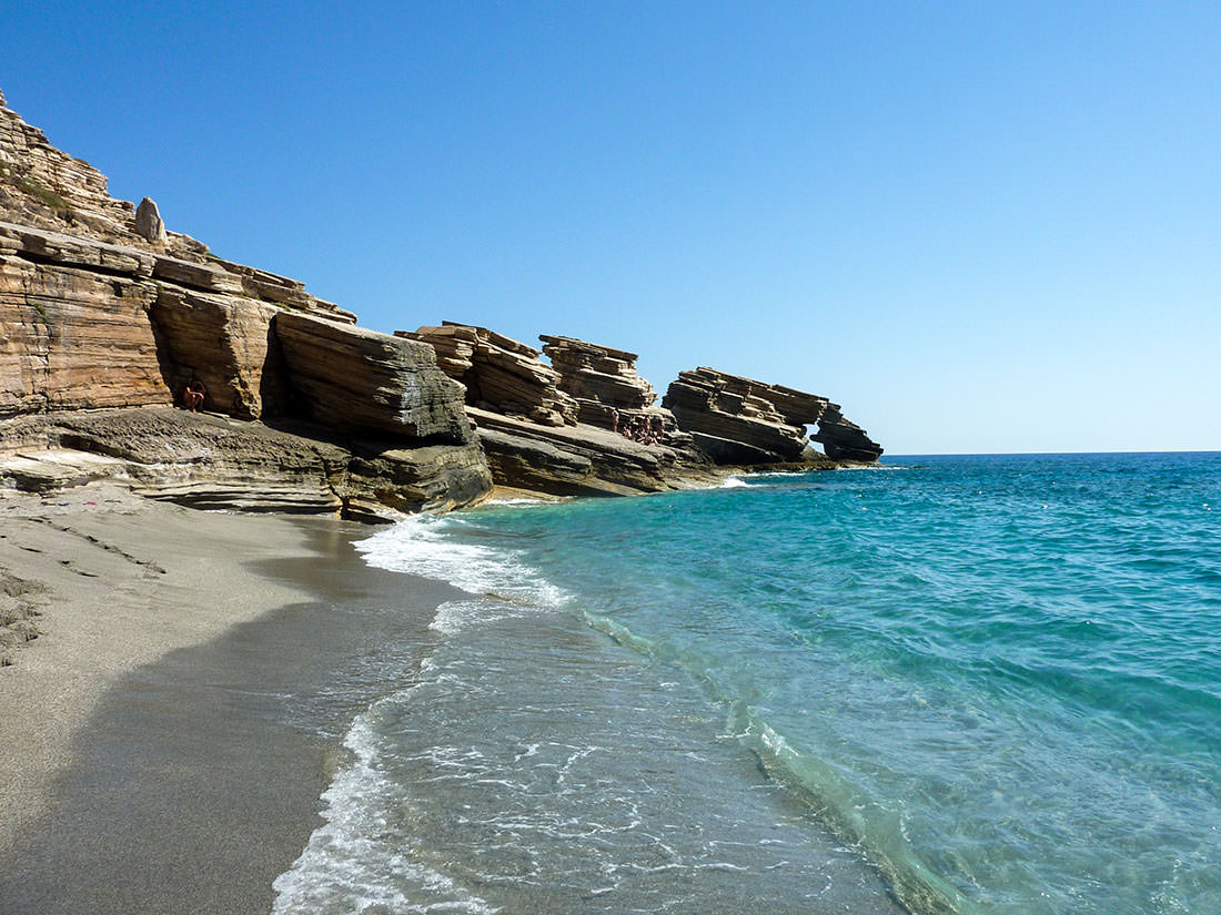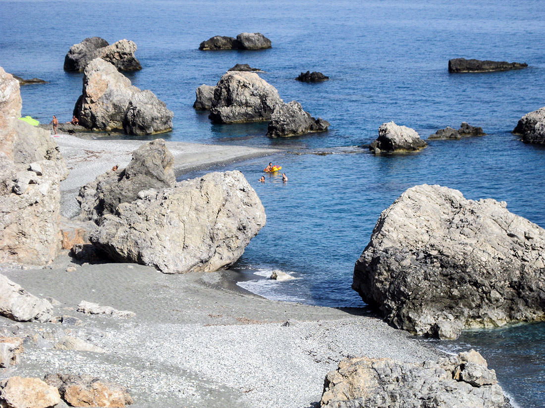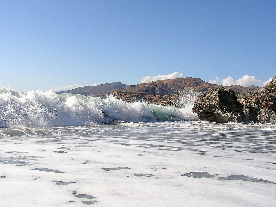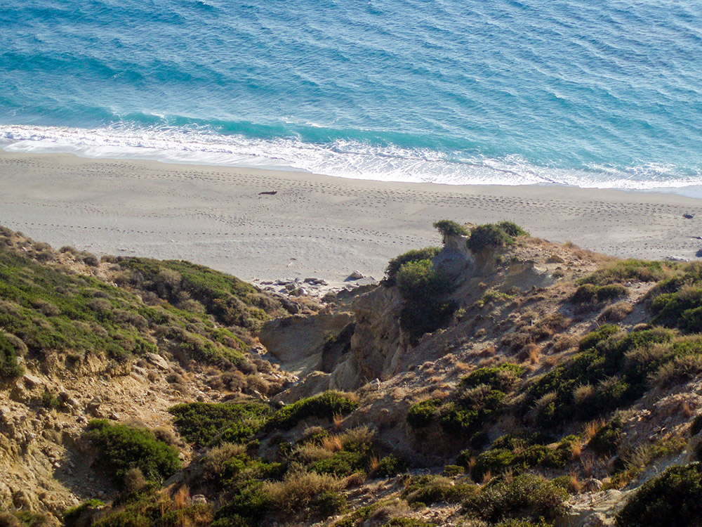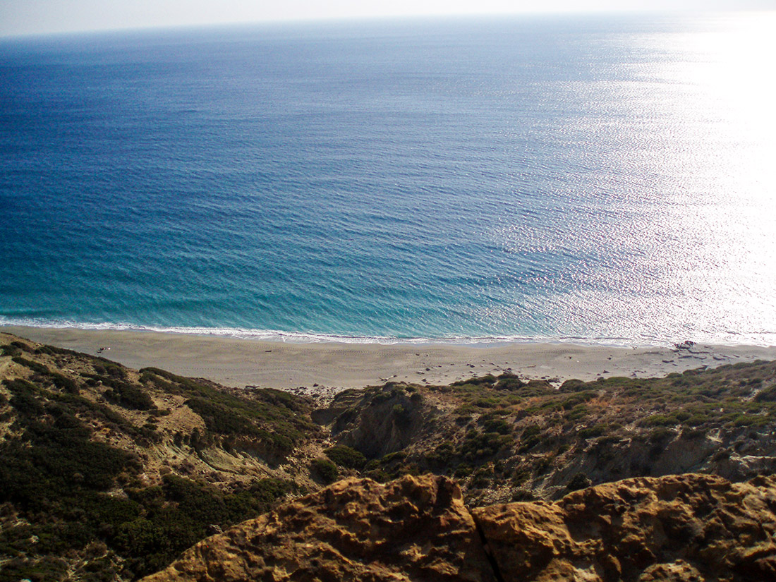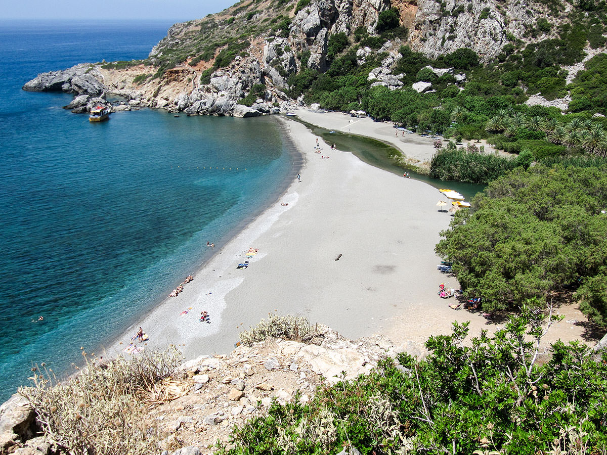 To the west lie the beaches of Ligres and Fotini where (as in Triopetra) Tavernas open in season. Further west is Preveli beach where the river forms a lake surrounded by palm trees in an area rich in fauna and flora overlooked by the famous Preveli Monastery.